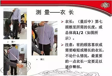 2、衣長:由前身左側脖根處,通過胸部最高點,量對需長度,一般量至手的虎口。