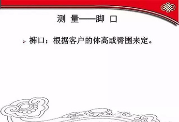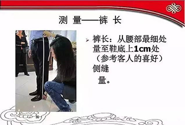 9、褲長:由腰部左側胯骨上端,向上4厘米往下量至腳跟減3厘米。