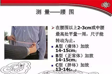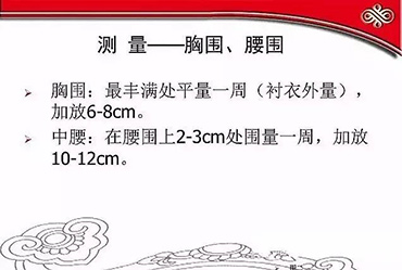 8、腰節:一般體型可按總體高算出。遇到特殊體型時,就需要量取前后的腰節尺寸(在腰部最細處,圍一條皮尺成水平),分別量取前后腰節的尺寸。